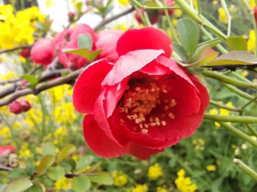 每年四月下旬海棠花朵随风摇曳,红的像火,粉的像霞,白的像雪,构成一幅色彩浓郁的美丽画卷。