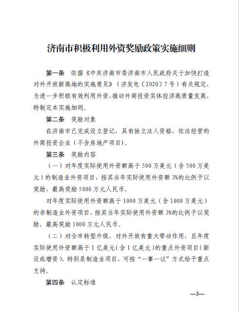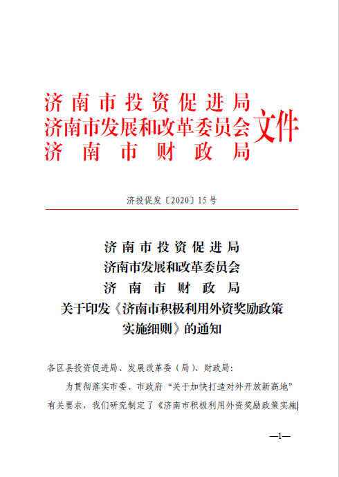 济投促发〔2020〕15号《济南市积极利用外资奖励政策实施细则》