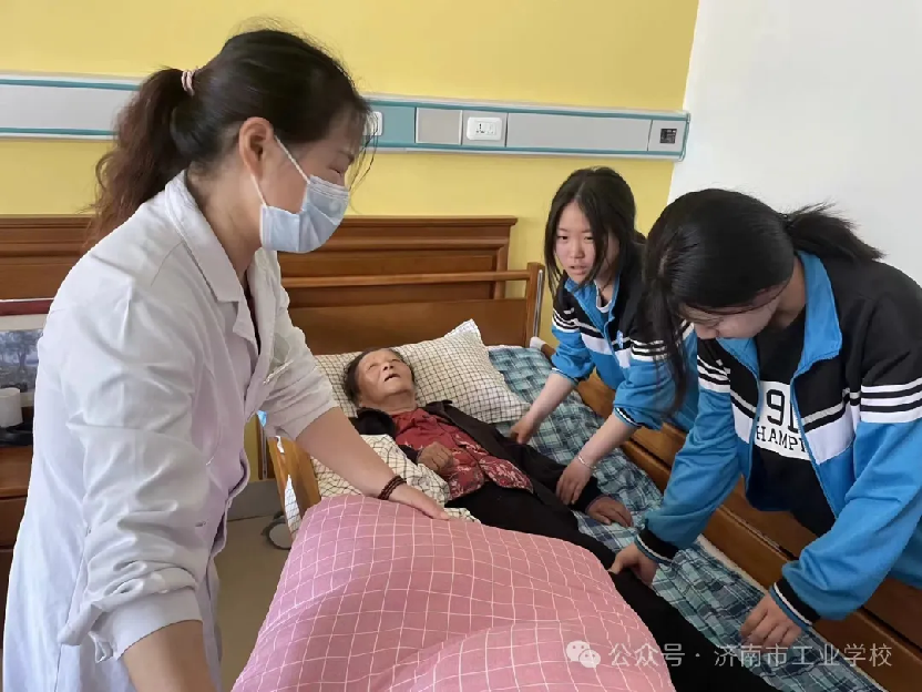 近日,济南市工业学校医学护理系2023级护理大专47名学生组成专业见习小组,赴平阴县金桔乐善康养院进行了为期一周的医疗见习。